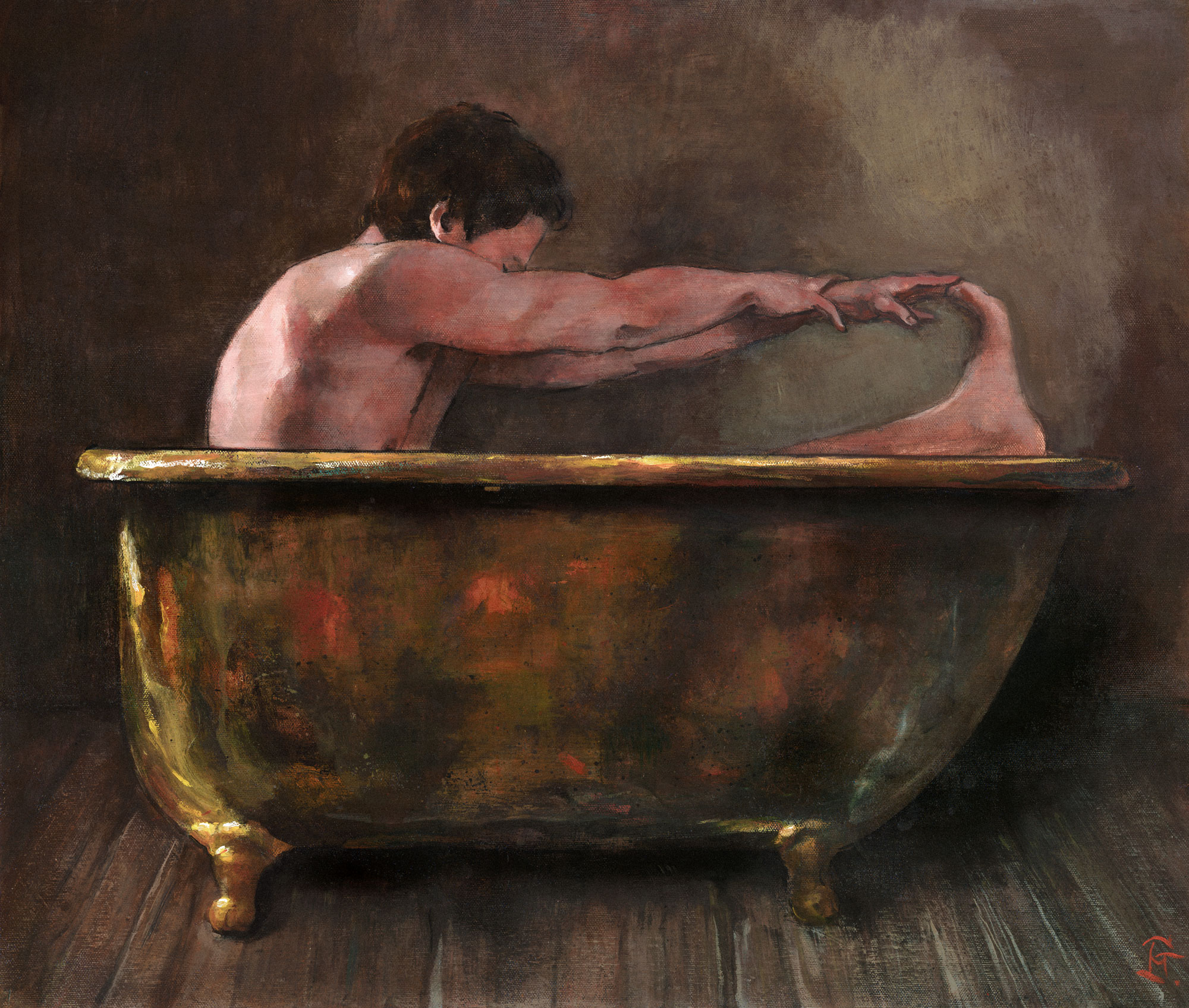 Additional keywords: original art, painting, male nude, bather, clawfoot tub