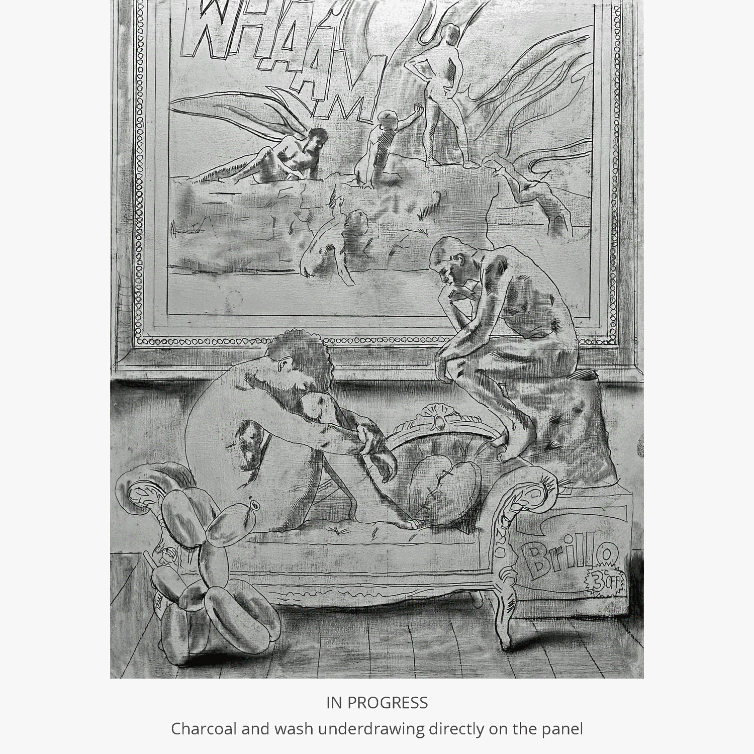 "... Volumes [are] spoken via these naked figures. This drawing could never imply as much if the subjects were clothed [...] you are at your best when that narrative imagination taps into truth laden images about the contemporary male psyche ..."