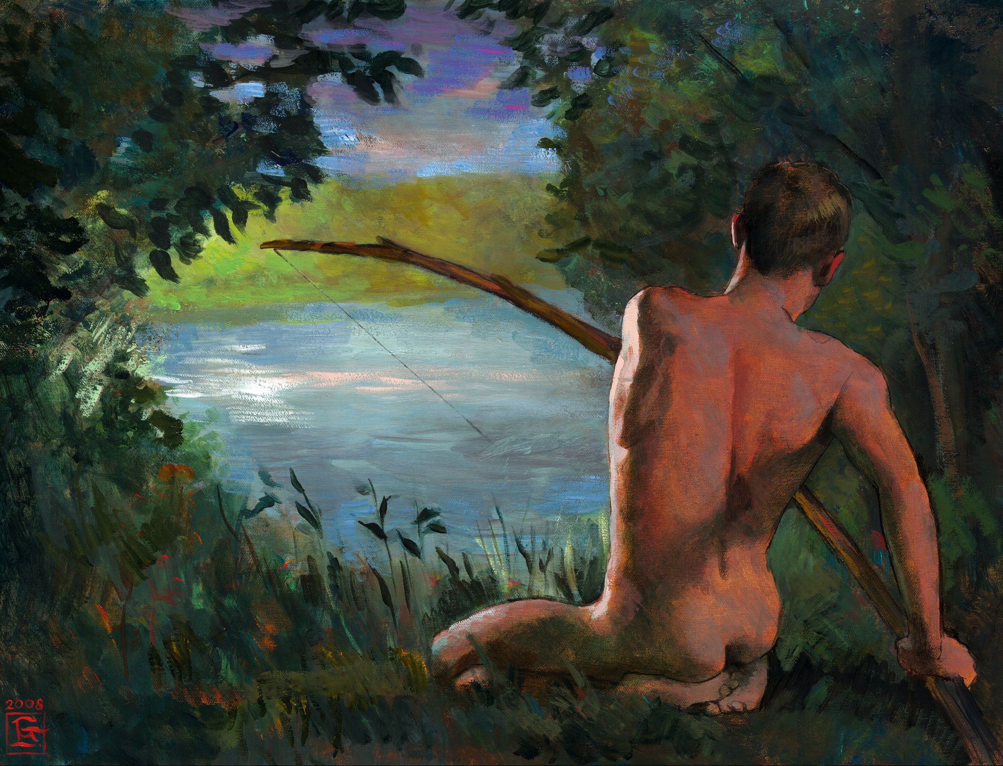 Additional keywords: original art, painting, male nude, bather, fishing, landscape, lake