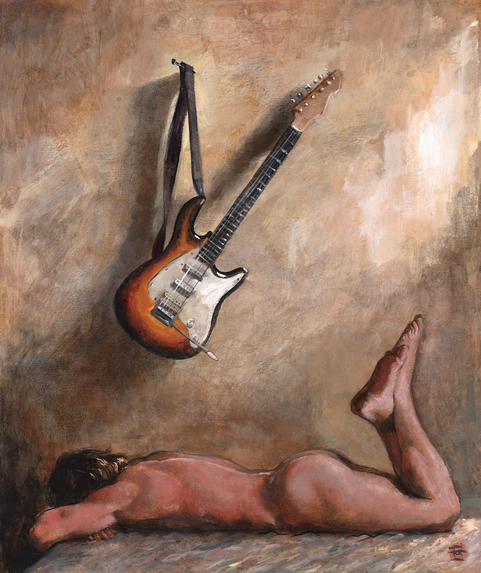 Additional keywords: original art, painting, male nude, interior, bed, guitar